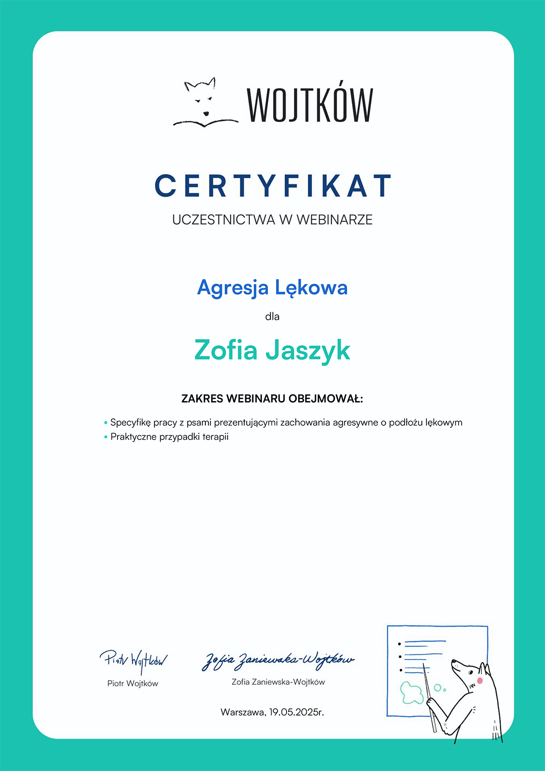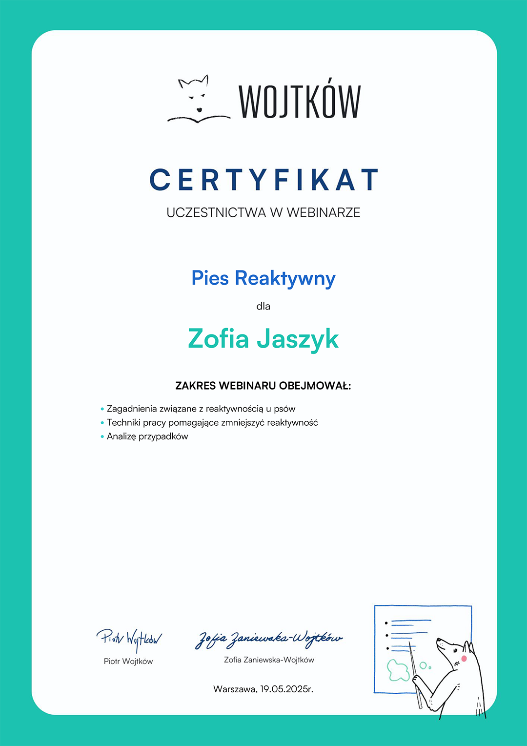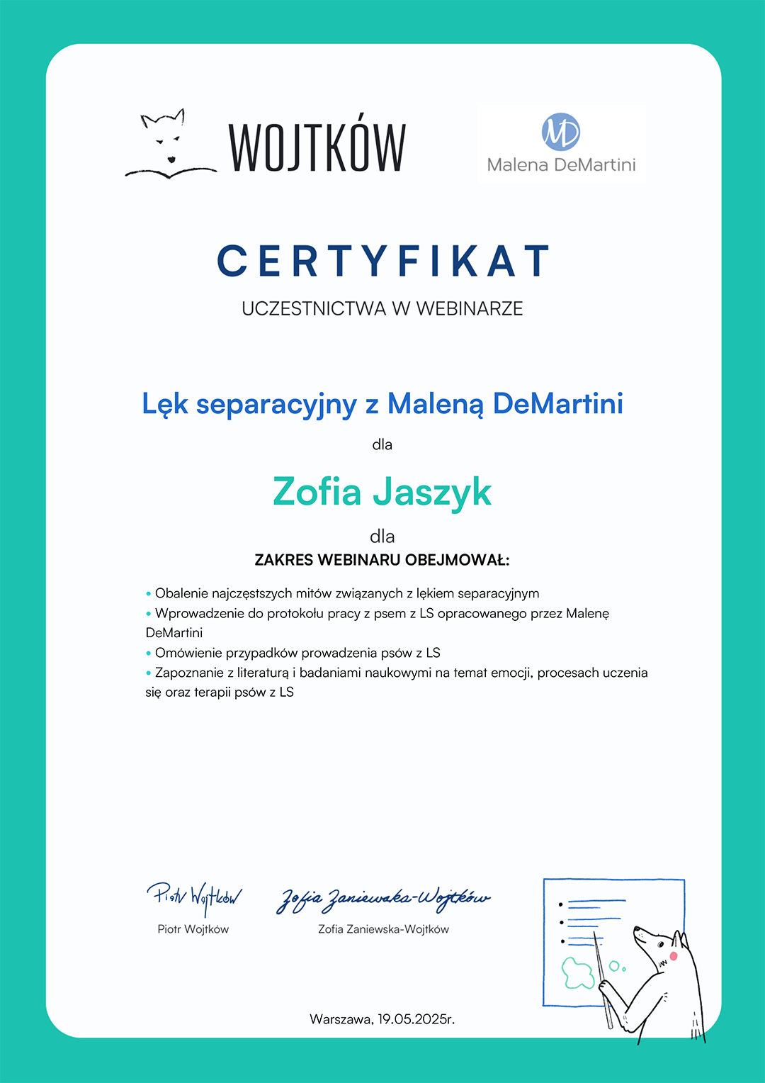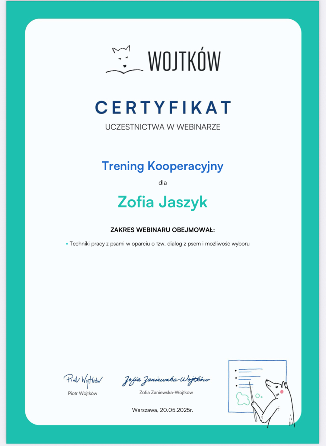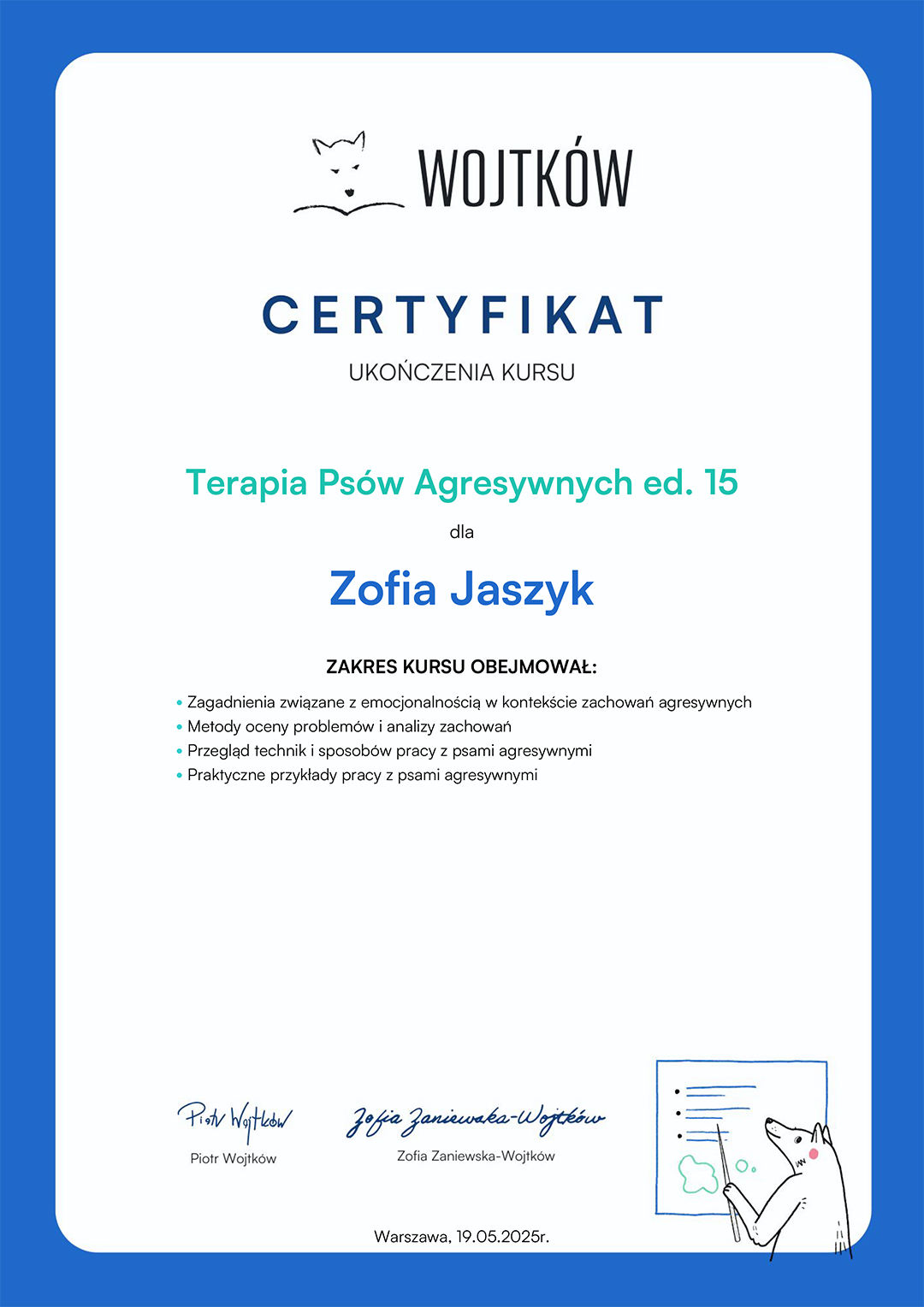 Nieustannie rozwijam swoje kompetencje, uczestnicząc w webinarach, szkoleniach i konferencjach, aby wspierać zarówno psy, jak i ich opiekunów. Moja praca opiera się na najnowszych doniesieniach naukowych oraz sprawdzonych, nowoczesnych metodach, dzięki czemu mogę zapewnić skuteczną i bezpieczną pomoc.