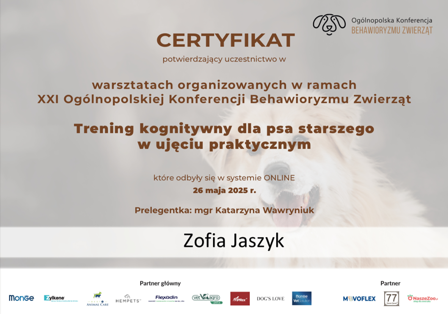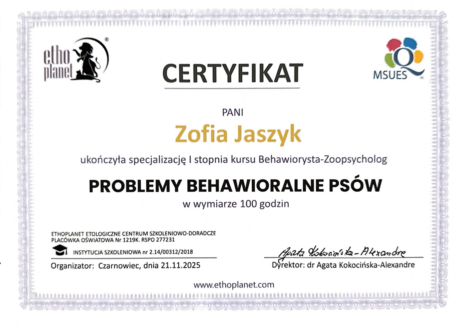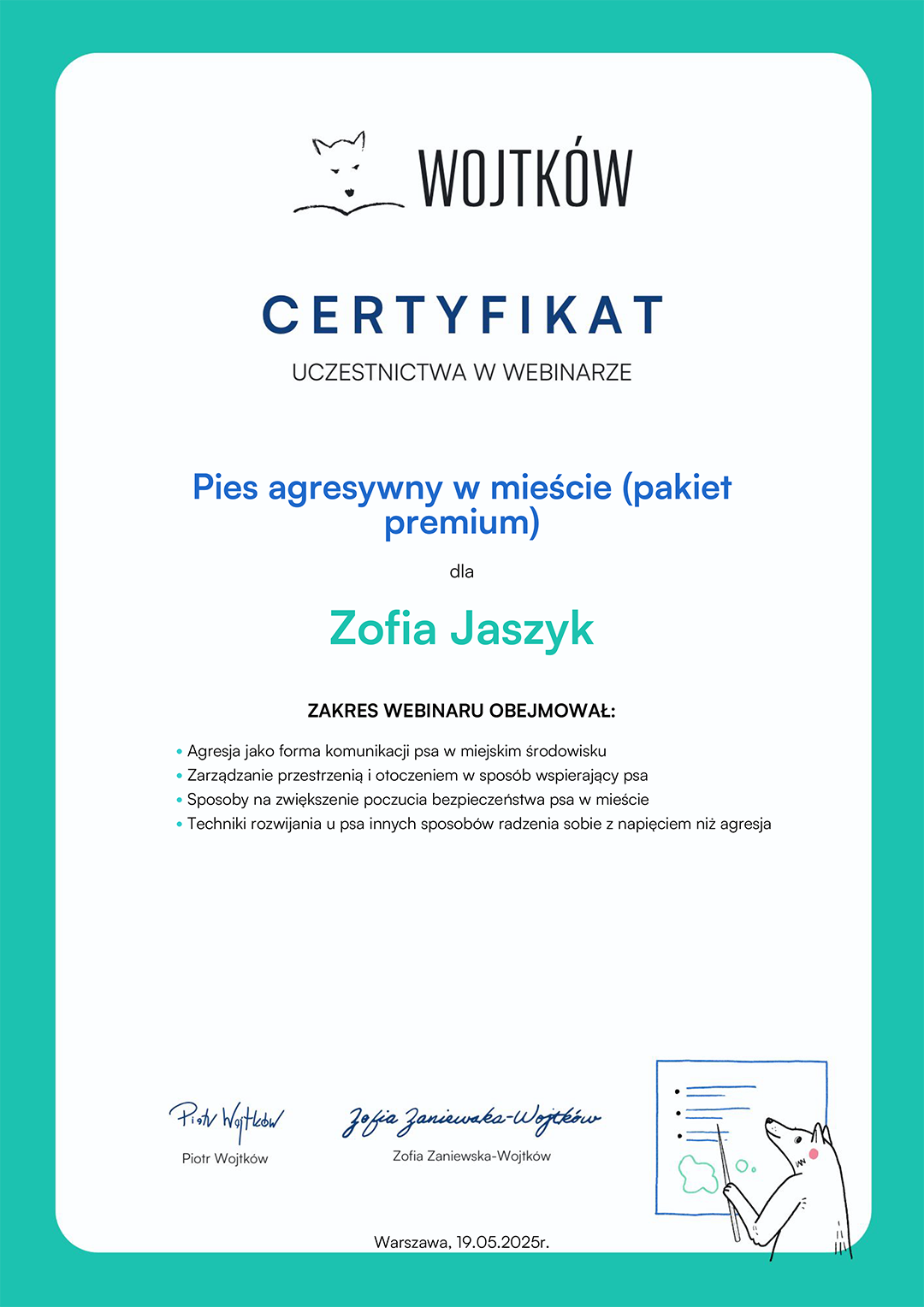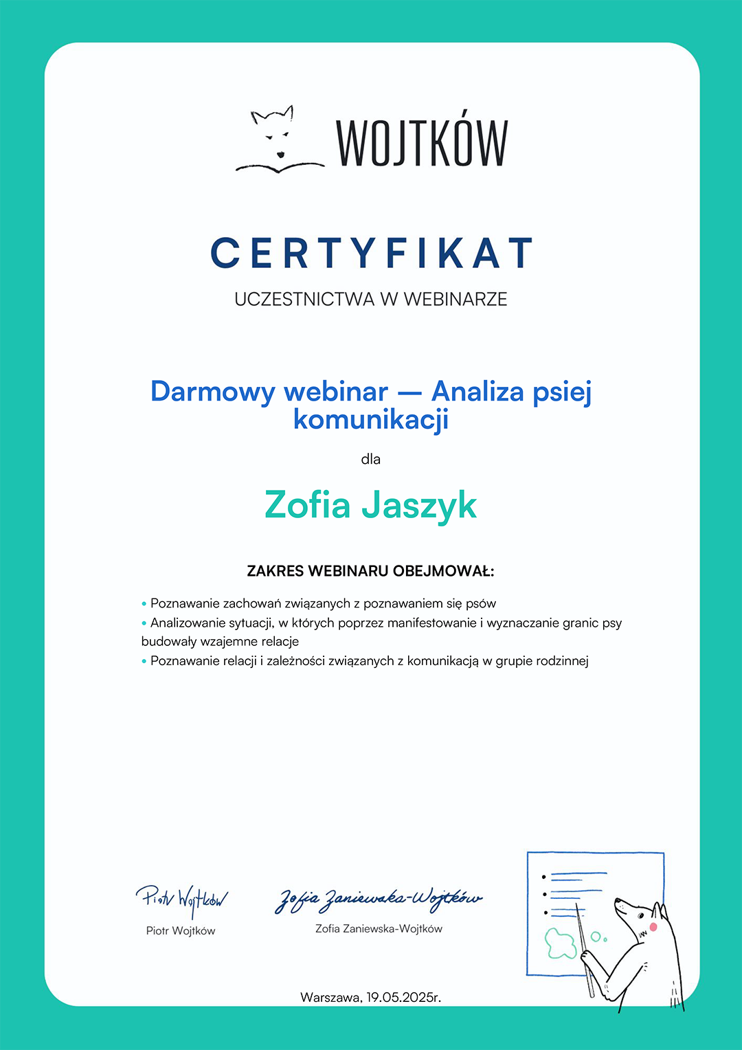 Nieustannie rozwijam swoje kompetencje, uczestnicząc w webinarach, szkoleniach i konferencjach, aby wspierać zarówno psy, jak i ich opiekunów. Moja praca opiera się na najnowszych doniesieniach naukowych oraz sprawdzonych, nowoczesnych metodach, dzięki czemu mogę zapewnić skuteczną i bezpieczną pomoc.