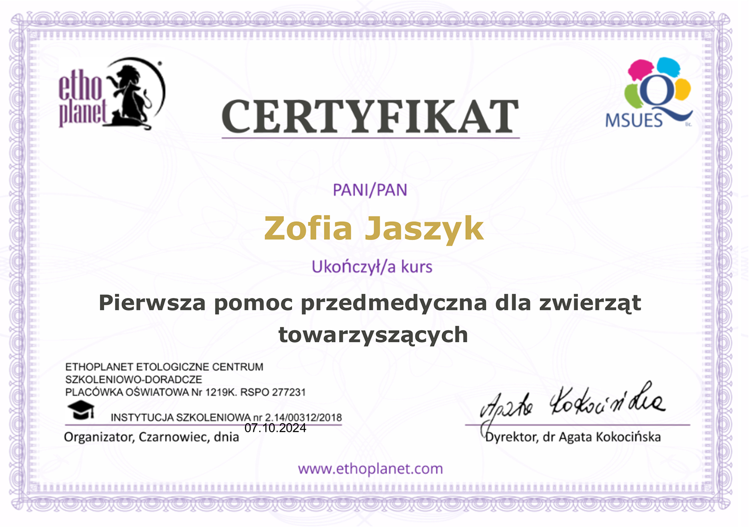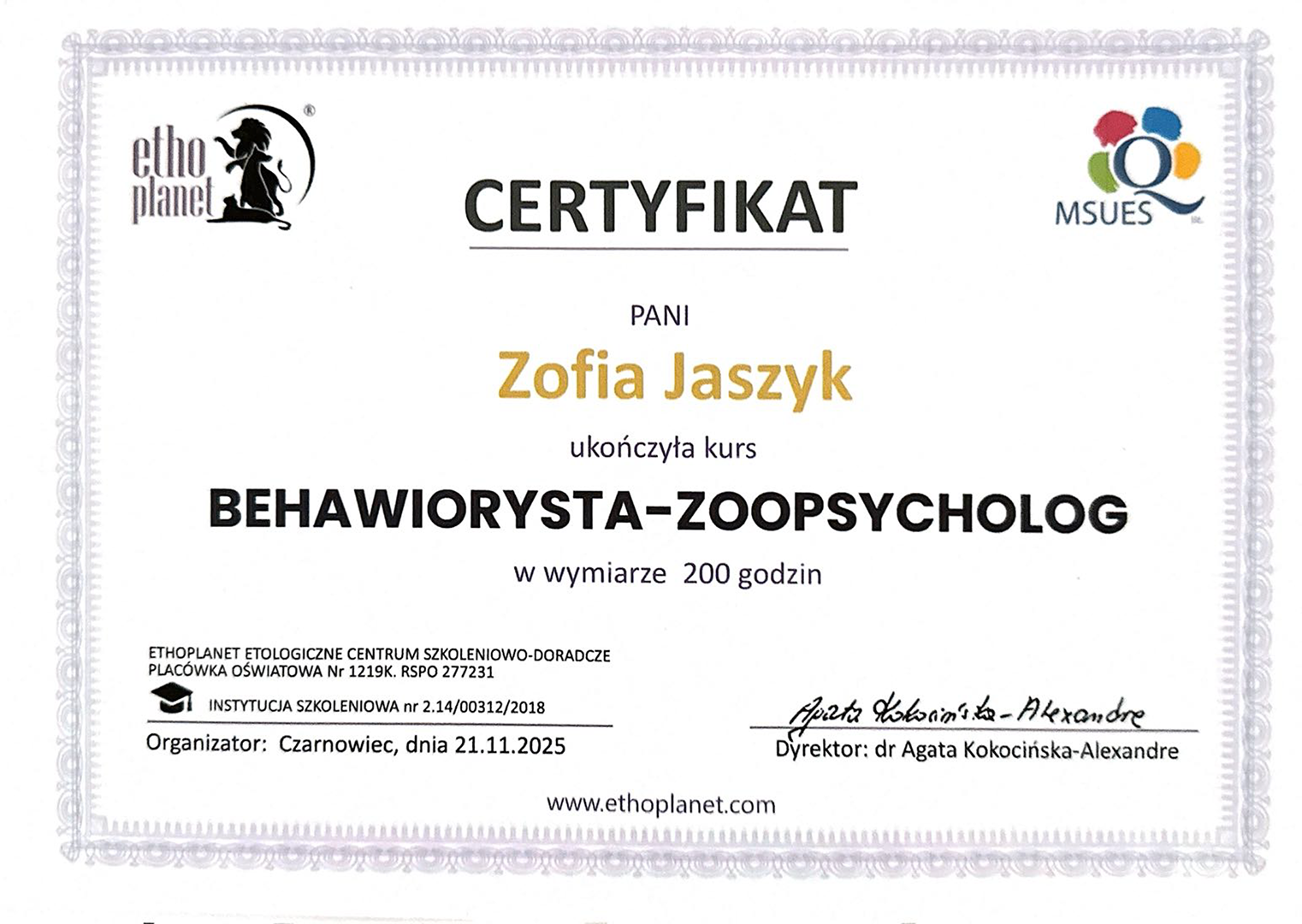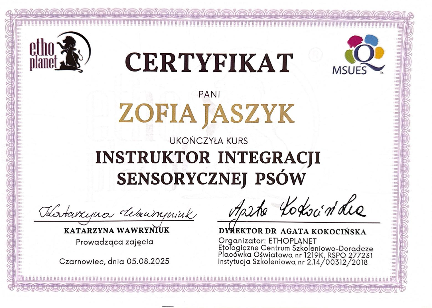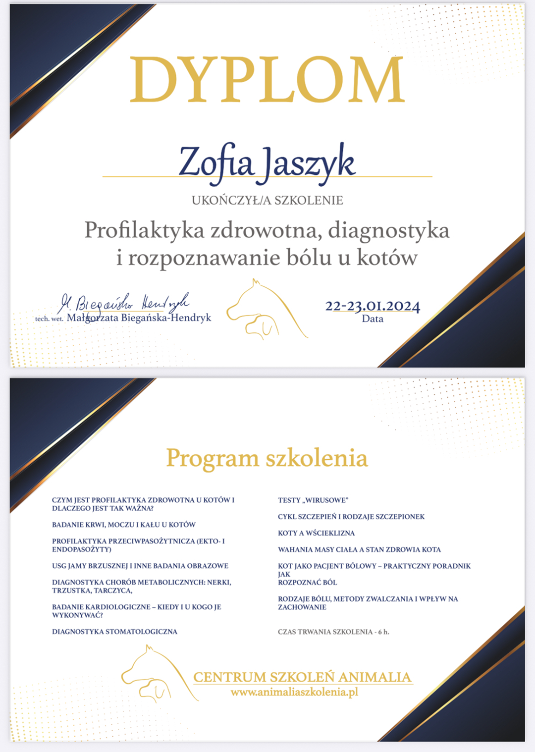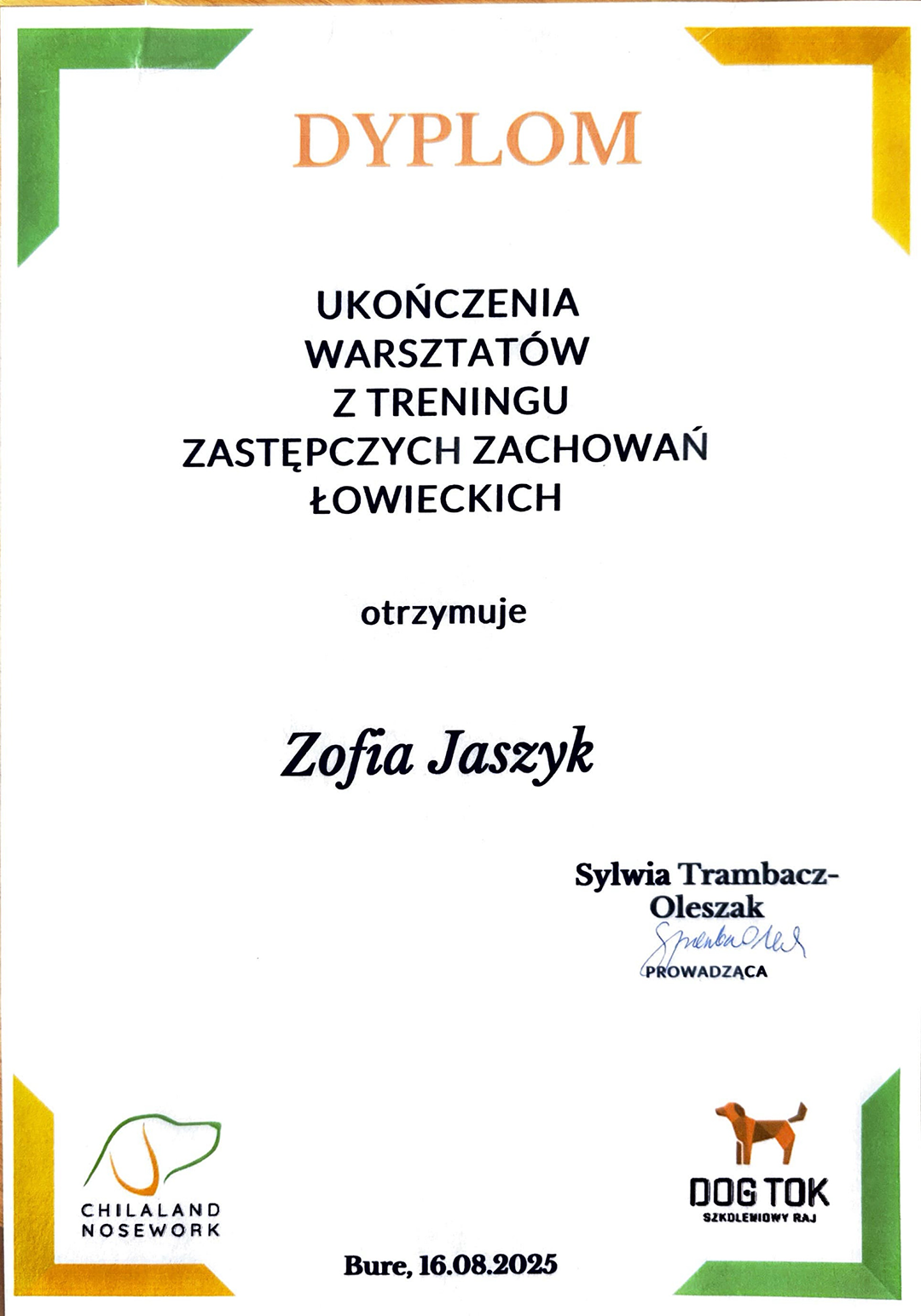 Nieustannie rozwijam swoje kompetencje, uczestnicząc w webinarach, szkoleniach i konferencjach, aby wspierać zarówno psy, jak i ich opiekunów. Moja praca opiera się na najnowszych doniesieniach naukowych oraz sprawdzonych, nowoczesnych metodach, dzięki czemu mogę zapewnić skuteczną i bezpieczną pomoc.